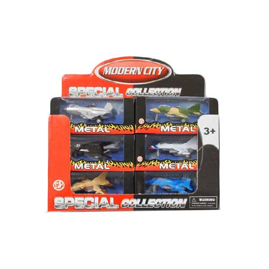 Displayed is a metal toy plane that comes in multiple colors. Made of die-cast metal, this toy plane is durable and strong. This toy plane is packaged in a window box.
