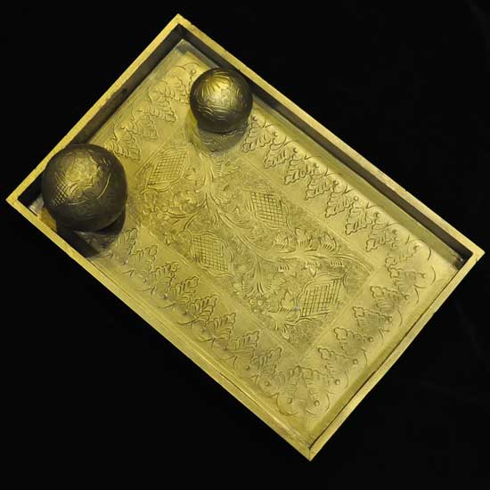 Displayed here is a metal tray that is rectangular in shape. There are engraved patterns on the top and the tray is splendid in golden color. The tray comes with two balls which are also engraved with patterns.