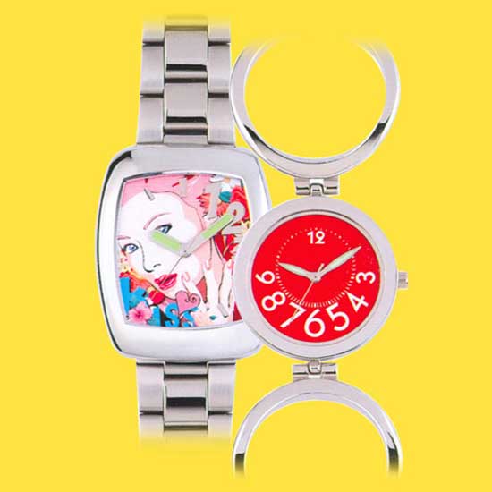 These distinctive watches feature solid metal construction in a mirror finish. One of the dials is designed with eye-catching graphics for added flair. The luminous watch hands allow you to read time easily in the dark.