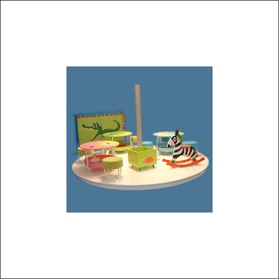- The room contains a rocking horse, round tables, chairs, a painting and some toys