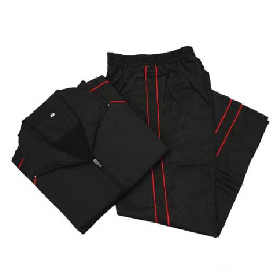 The tracksuit is designed in a modest black with red streaks as styling decorations. The set consists of a jacket and a pair of trousers. The jacket comes with a zippered front and the trousers feature a loose fit for added comfort.