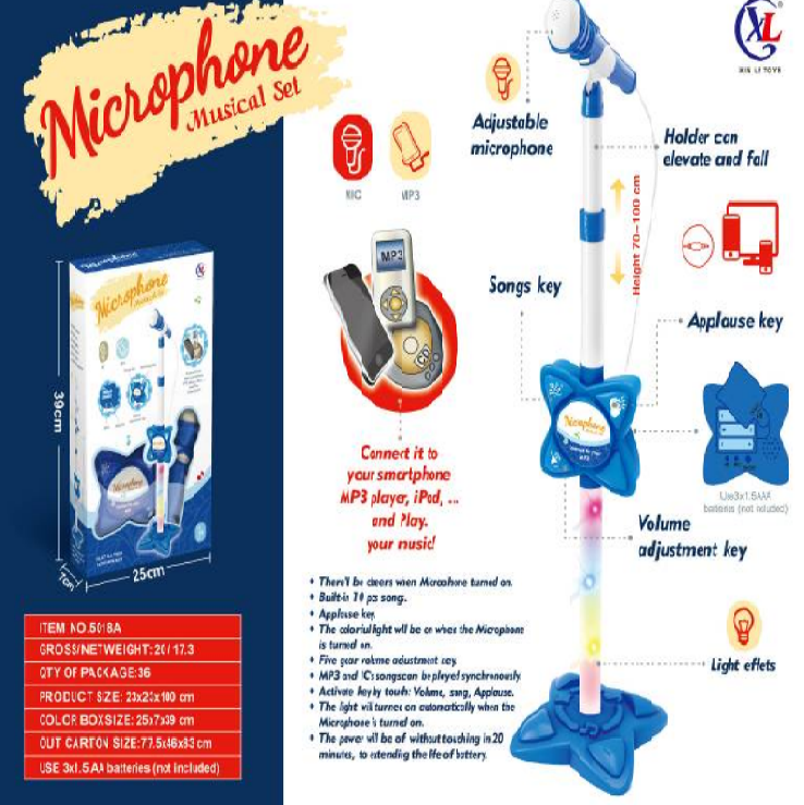 Stylish Stage Microphone with sound effects ,10 songs and applause effects, touch sensitive ,adjustable Microphone stand,MP3 cable.