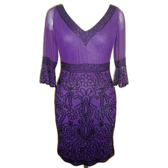 This ladies' dress pleases your eyes with a sophisticated design. It comes with see-through middle sleeves and a deep V-neckline. The purple dress is highlighted by delicate embroidery with shiny beads and sequins as embellishment.