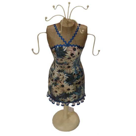 This showcased jewelry stand is designed in the form of a mini mannequin. It is decorated with a charming floral dress with ruffles. Users can hang accessories such as bracelets and earrings on this fancy little stand.