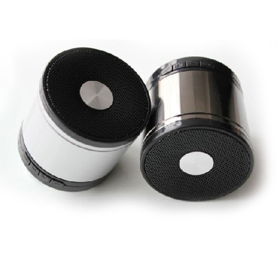 The pictured mini speakers feature cylindrical-shaped casings in a silver or white color. The compact yet functional speakers boast exceptional sound quality. They can directly play music from SD memory cards.
