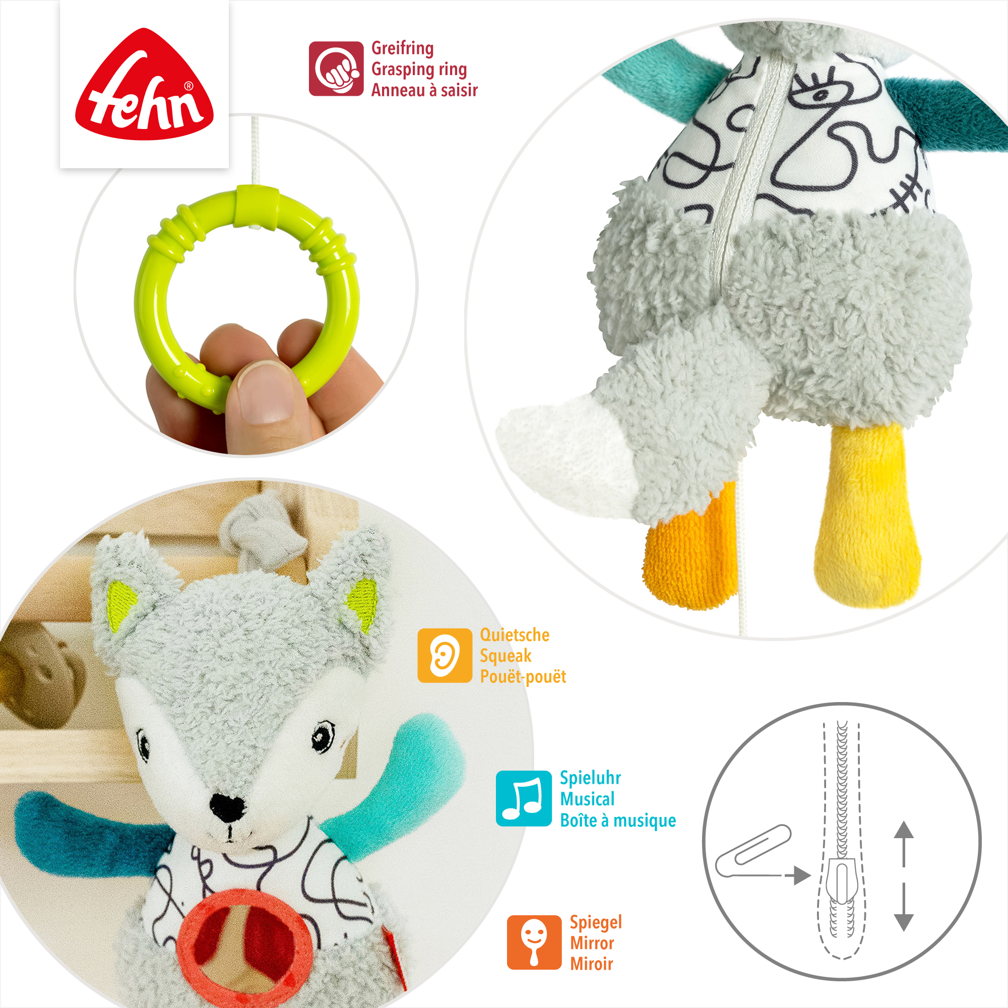 The grey fox with musical from the DoBabyDoo collection is not only a great first companion for babies from birth, but also comforts and soothes with its gentle "Weißt du wieviel Sternlein stehen" melody. The modern shape of the little sleep aid fits perfectly in little baby hands. The hidden squeak in the fox invites the baby to grasp it and a small mirror playfully encourages baby's self-awareness. Thanks to the two ribbons, the colourful mini musical can be easily attached to the cot, baby car seat or pram. The fox is a cute playmate and eye-catcher for the baby - whether at home or on the go. --- with squeak, mirror and removable wind-up chime / melody: Weißt du wieviel Sternlein stehen / playing time approx. 1.5 - 2 minutes / Remove the musical chime before washing / Adult use of the safety zipper required / Top material: plush, printed fabric, velvet, terry, muslin / Filling: polyester / ideal as a gift for birth, birthday or baptism for babies and toddlers / tested for safety by independent testing institutes
