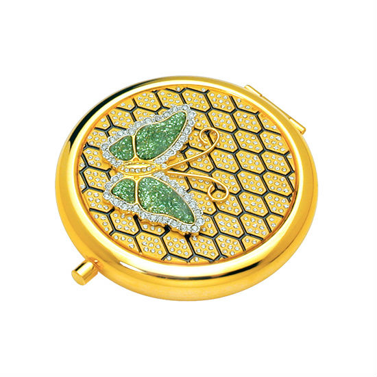 Shiny Gold Plated with crystals & green arcylic wings butterfly, white crystals and honeycone in black color with white crystals as background