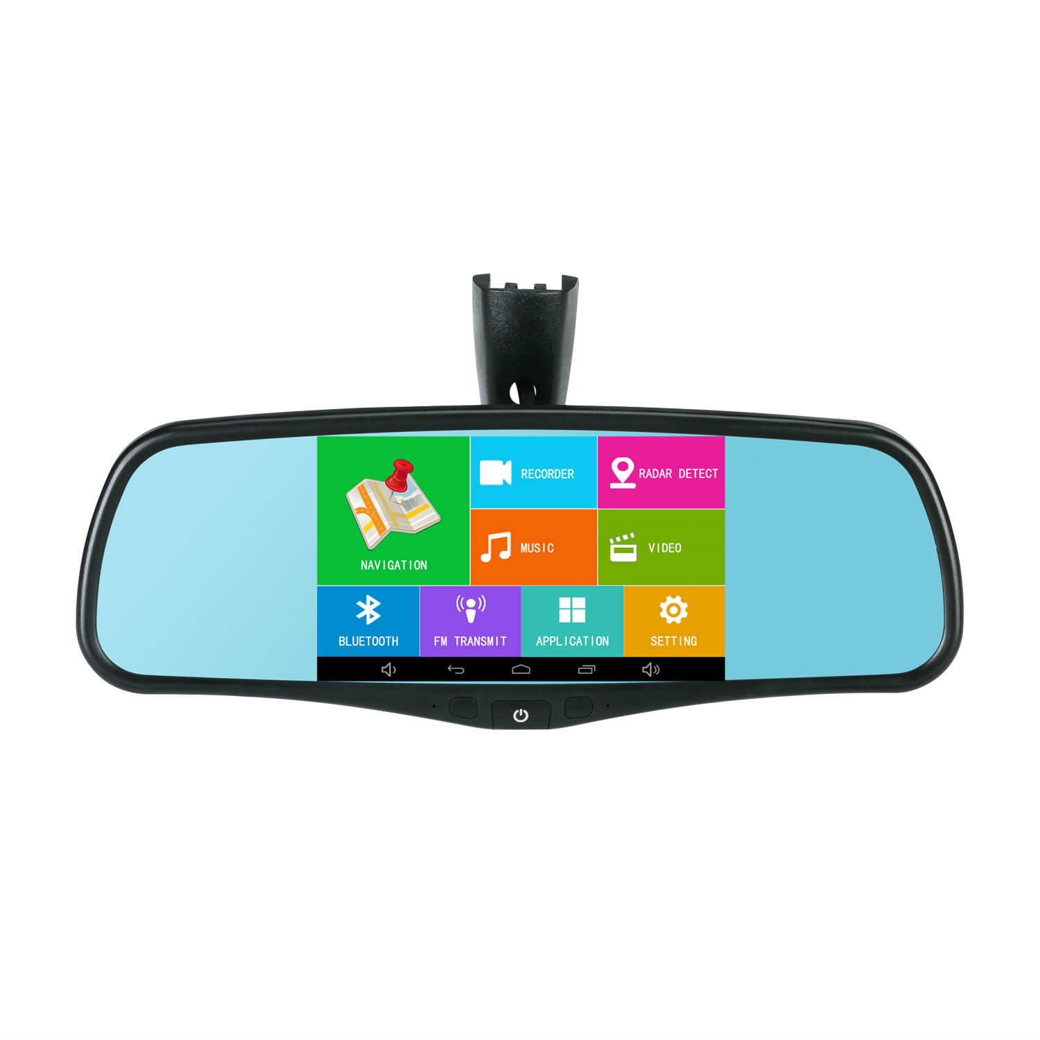 Rear-viewed mirror GPS navigator, Digital video recorder, Radar detector for speed alarming, bluetooth, Reversed camera in, FM transmit, music and video player. Andriod OS.