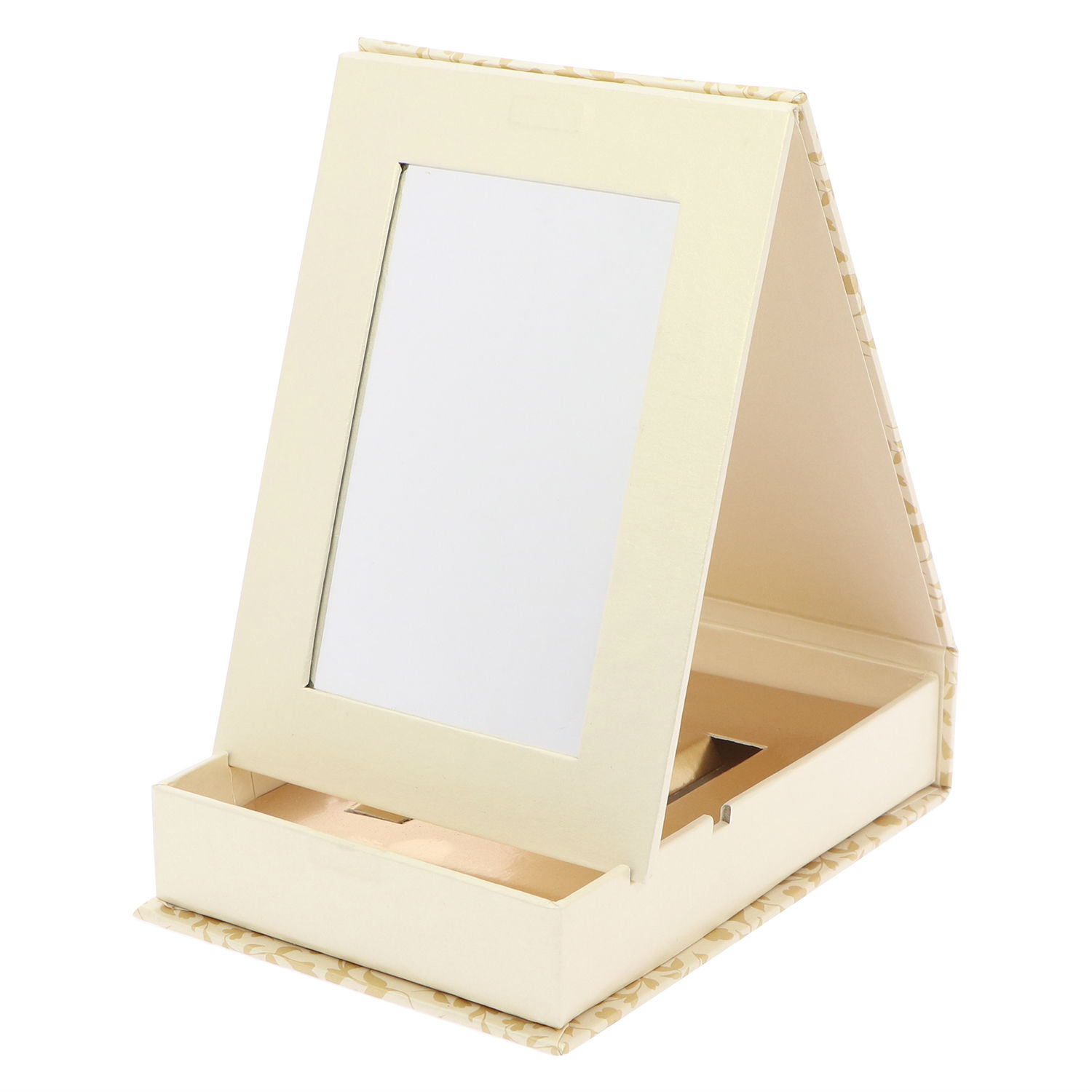This packaging box comes in a compact rectangular design and is decorated with elegant floral patterns on the exterior. It has an inner tray for holding jewelry, like rings, necklace, bracelet in place and is ideal for packing your jewelry. The packaging box is equipped with a fold-up standing mirror at the back of the lid and is versatile and convenient to use.