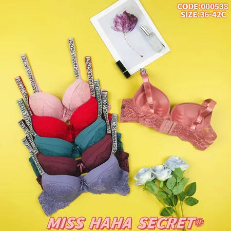 Introducing the Miss Haha Secret Bra (Code: 000538) — a stylish and supportive lingerie piece tailored for sizes 36-42C. Offered in a range of elegant colors including pink, red, teal, burgundy, and lavender, this bra features intricate lace detailing for a touch of sophistication and “MISS HANA SECRET” branded straps for a trendy flair. Designed to provide both comfort and shaping, it’s ideal for daily wear, offering a flattering silhouette and a seamless blend of fashion-forward design and practicality. Whether you seek lace-accented elegance, a customizable fit, or size-inclusive comfort, this Miss Haha Secret bra is a standout choice for elevating your lingerie collection with style and confidence.