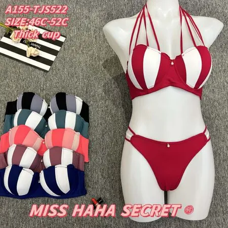 The Miss Haha Secret Thick Cup Striped Lingerie Set combines bold style and enhancement. It features thick cup padding for a lifted silhouette, a striking striped pattern, and a multi-strap halter design for added allure. The matching thong complements the bra’s design, available in colors like red-white, gray-white, teal-white, coral-white, mauve-white, and navy-white. Sized 46C-52C (code: A155-TJS522), this set offers both eye-catching fashion and supportive comfort, making it ideal for those who want to embrace a confident and stylish look in their intimate wear.