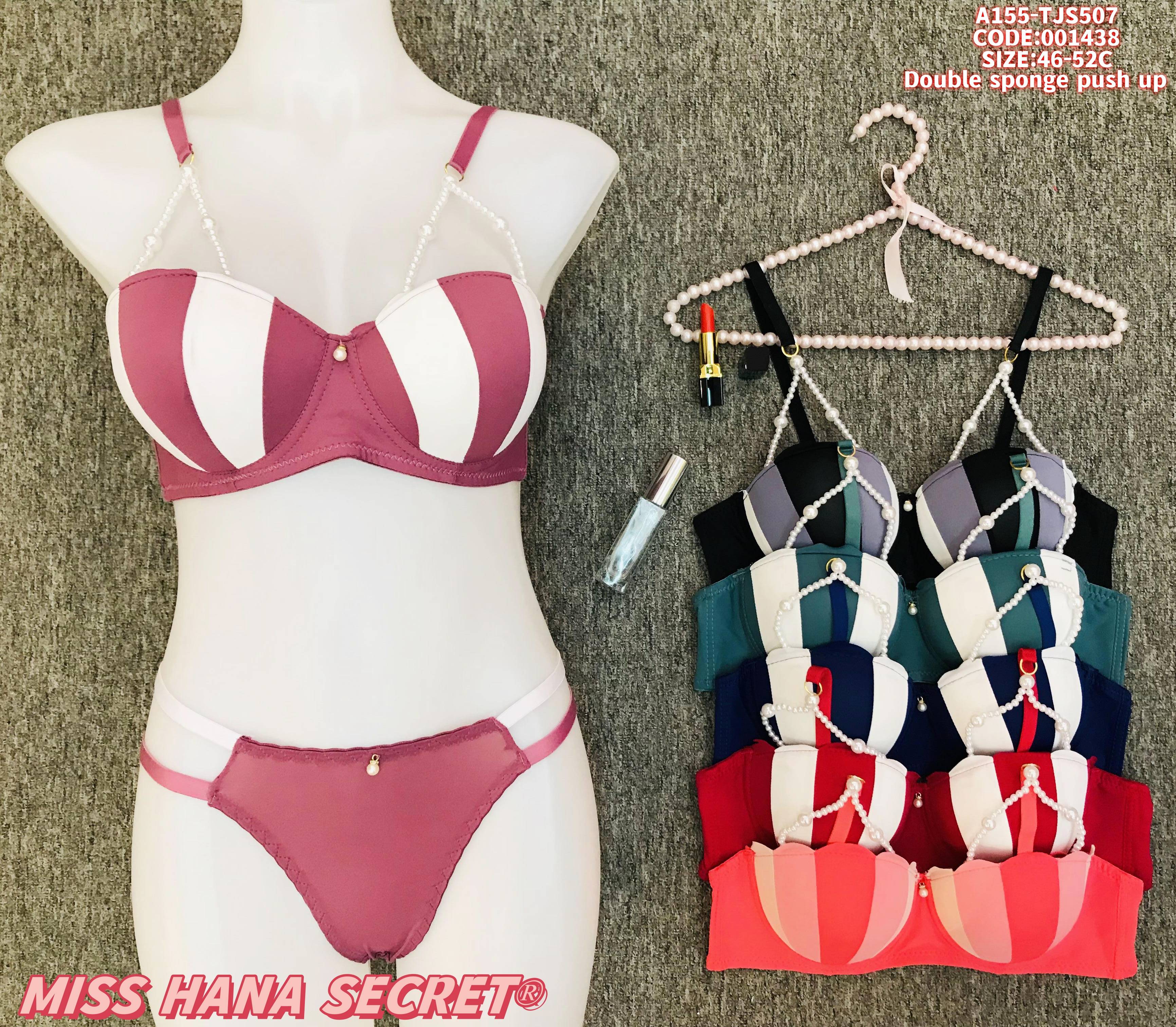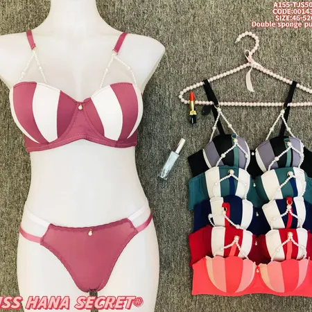 The Miss Hana Secret Striped Double Sponge Push Up Lingerie Set combines playful style and enhancing design. It features bold color blocking stripes, double sponge padding for a lifted look, and elegant pearl-adorned straps for a touch of romance. The matching thong complements the bra’s design, and the set is available in colors like pink-white, multicolor, and red-white. Sized 46-52C (code: 001438), it offers both visual appeal and comfort, making it a standout choice for those seeking a blend of fashion and allure in their intimate wear.