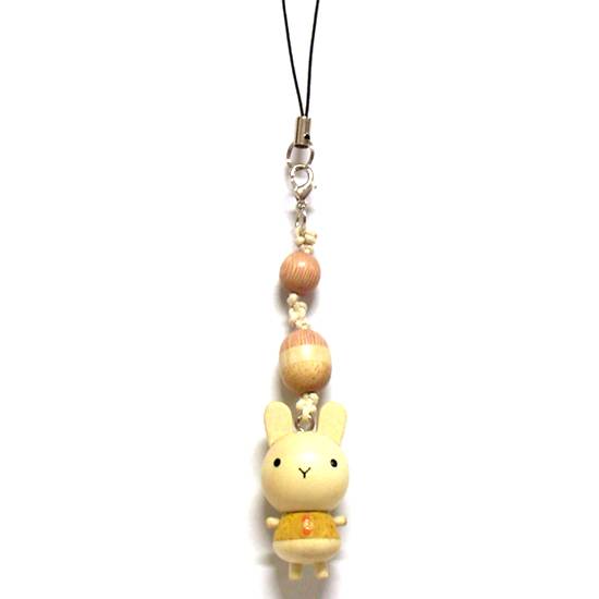 This is a cell phone/mobile phone lanyard. This landyard is designed with two wooden balls and a cartoon underneath. Fashionable mobile phone accessory.