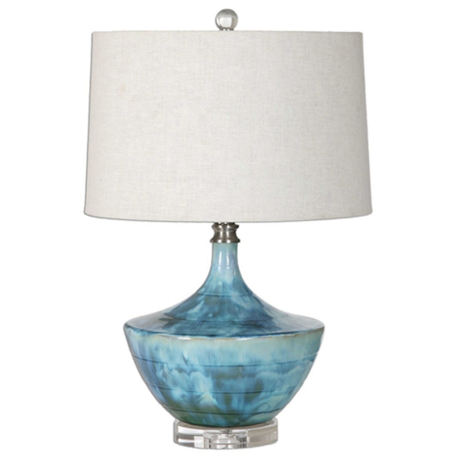 Made with a multi-tone glaze finish, this transitional contemporary ceramic table lamp is sure to add a touch of elegance to your space. With an unique round base and a top finial in clear crystal, this stunning large luxury table lamp is completed by a slightly tapered light camel linen shade providing warm and cozy illumination. Stylish and fashionable, this attractive blue side table lamp is going to make a statement to your bedroom, living room, entryway console table, etc.