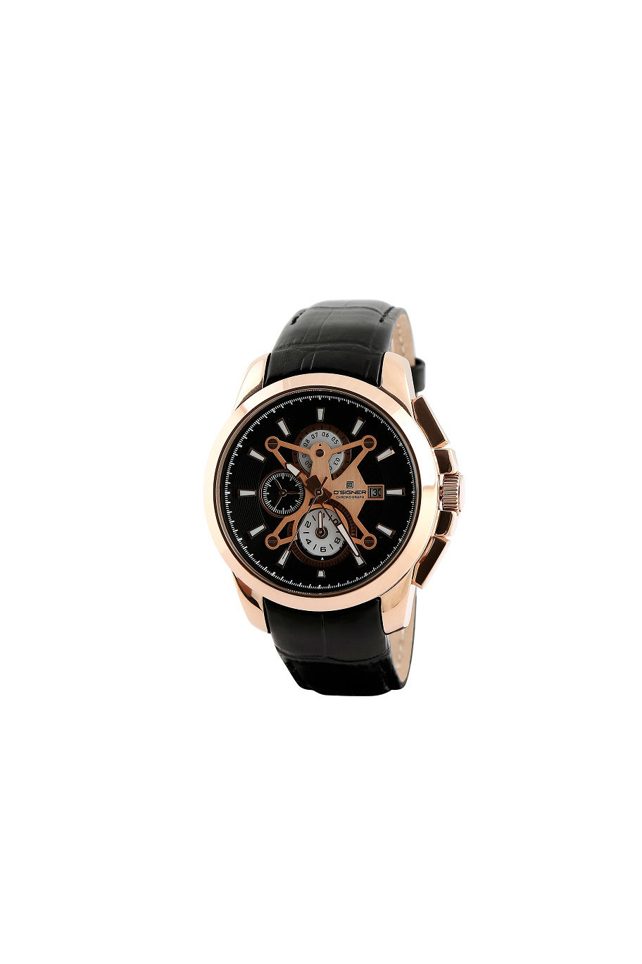 This mens chronograph watch flaunts a fashionable and luxurious design and delivers remarkable accuracy. It has a stainless steel case in rose gold tone and has a black round dial with bar shaped hour markers. The watch has a genuine leather strap is comfortable to wear.
