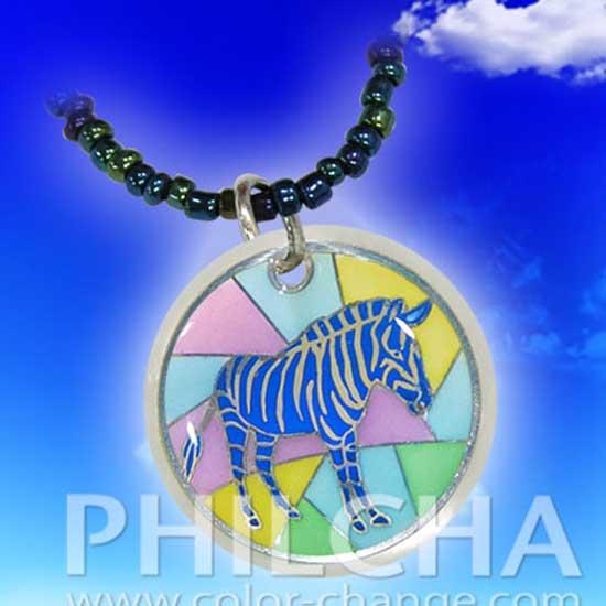 Highlighted is an exquisite necklace coming with a beaded chain and a pendant. The pendant is set on a shell base, which is embellished with colorful mosaic patterns. The zebra pattern at the center will change colors to show your mood.