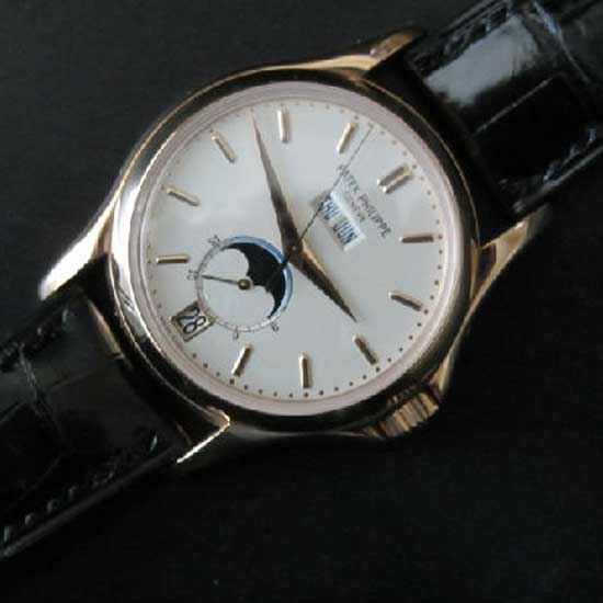 This Patek Philippe moon phase watch embodies classic elegance and exceptional craftsmanship. It boasts an exquisite, subtle design with a simplistic appearance. This meticulously crafted timepiece is a work of timeless glamour and grace.