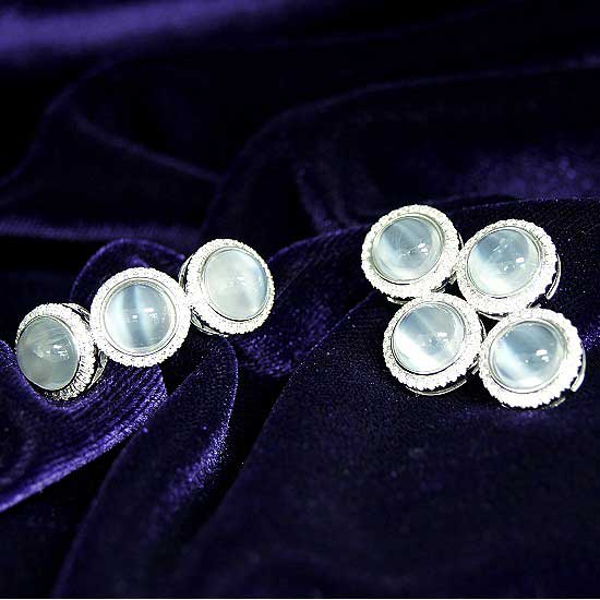 Featured here is a set of jewelry made with moon stone and diamonds. The set includes a ring and a pendant. The moon stone is set in the embrace of sparkling diamonds, giving a simple yet elegant look.