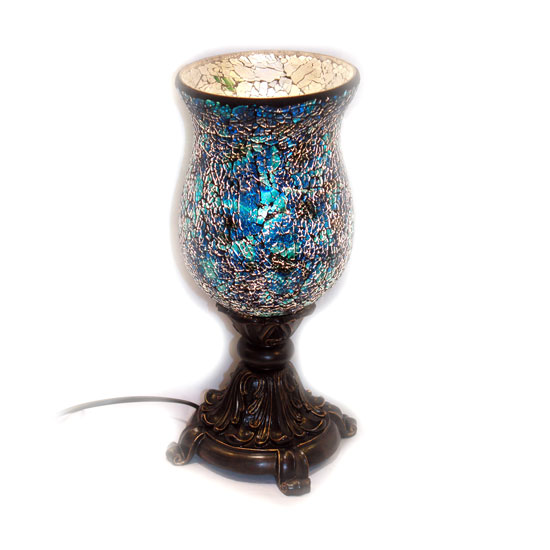 This is an exquisite desk lamp featuring a gorgeous mosaic lamp shade. The mosaic patterns are made of glass to exude colorful light. The base comes with delicate carvings with a vintage touch.