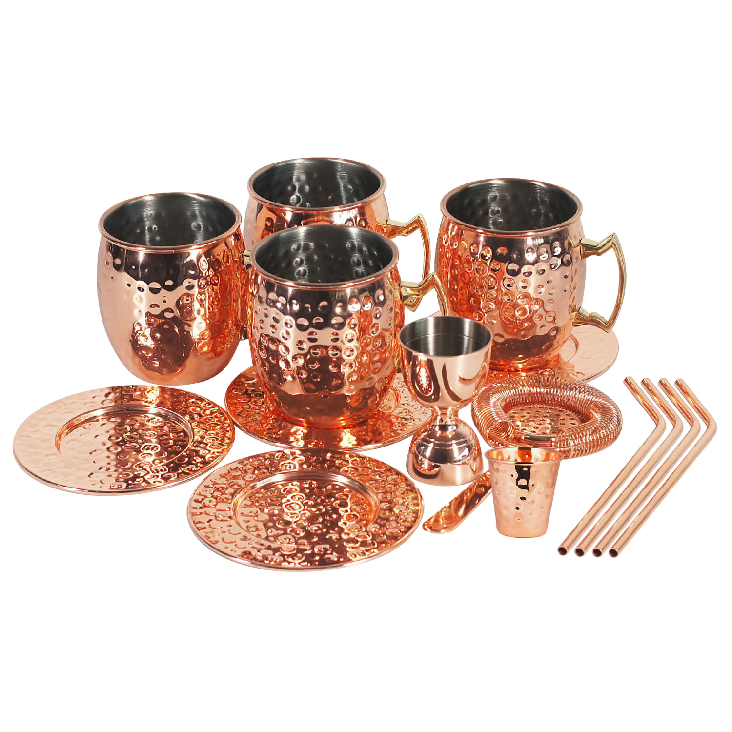 This set of Moscow mule mugs is made of FDA stainless steel 304 and includes plates, straws and other accessories. The Moscow mule mugs have gold color plating and are available with hammered dot or smooth surfaces. They are safe and convenient to use and are excellent for serving all kinds of cocktails.