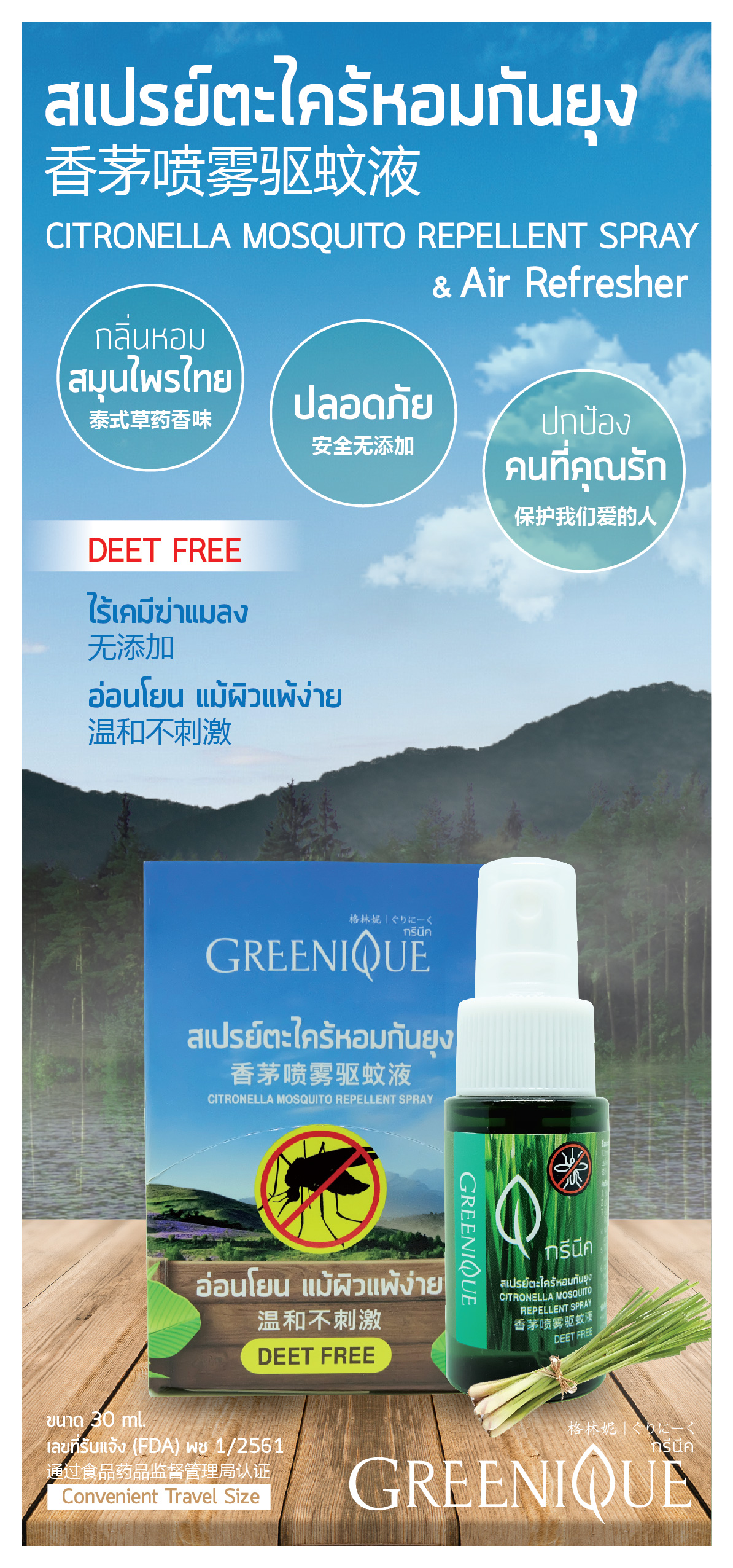 Say goodbye to the insect bites and keep the mosquitoes at bay in the coming scorching summer days with this mosquito repellent spray. Formulated with citronella essential oil without DEET and fragrance, this mosquito repellent spray helps protect you from the unpleasant mosquito bites without irritating your skin, making it a perfect companion for your great day in the countryside or camping site.