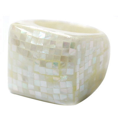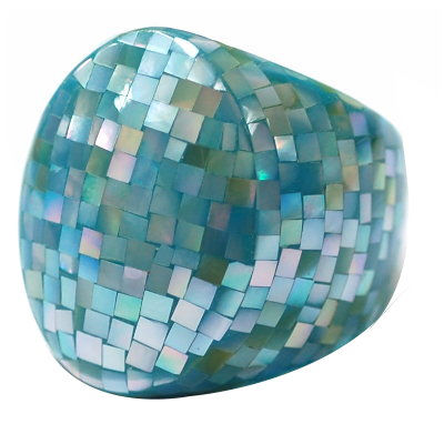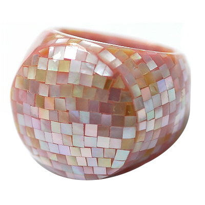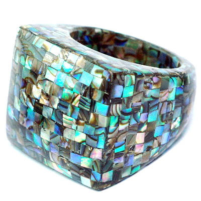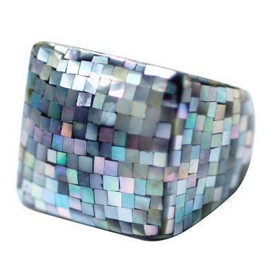 Exquisite multi-colored fancy shape in mosaic MOP inlaid ring collection.