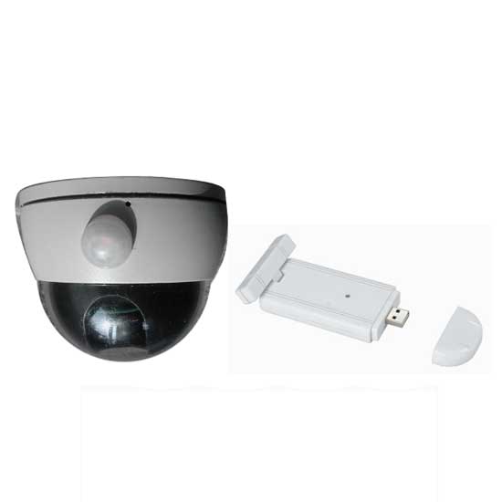Showcased is a motion sensor with a digital wireless dome camera and a USB wireless receiver. When the sensor detects motions, the receiver will beep 20 times. The USB receiver can receive 4 cameras at the same time with a transmission range of up to 100m in open areas.
