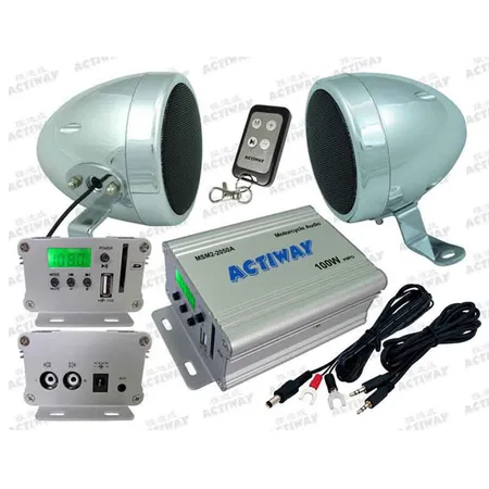 This motorcycle audio system features a detachable amplifier and 2 weatherproof loudspeakers. The multi-direction rotating loudspeakers guarantee excellent stereo sound effects. With 3.5mm Aux input, the audio system can be connected with any CD, MP3 or MP4 players.