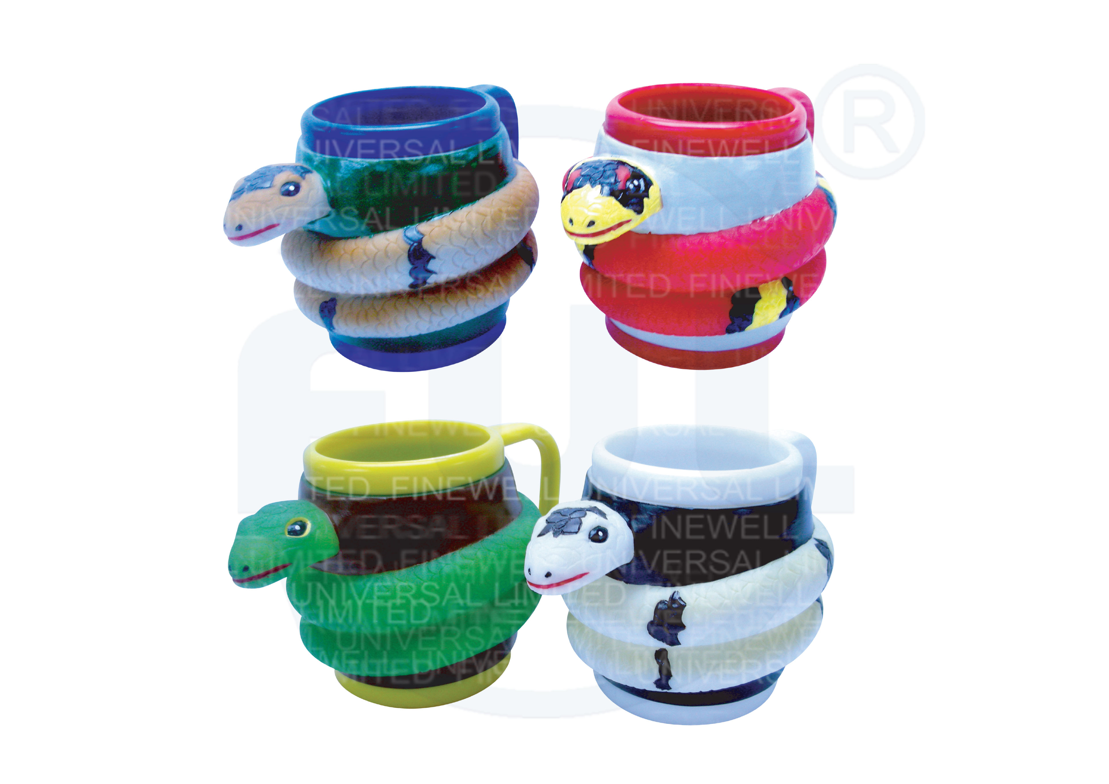 This roto cast vinyl mug set includes four barrel-shaped mugs with constricting snakes. The mugs come in different colors and have handles on the side for comfortable holding. These fun and eye-catching mugs are excellent for special occasions and are suitable for both hot and cold beverages.