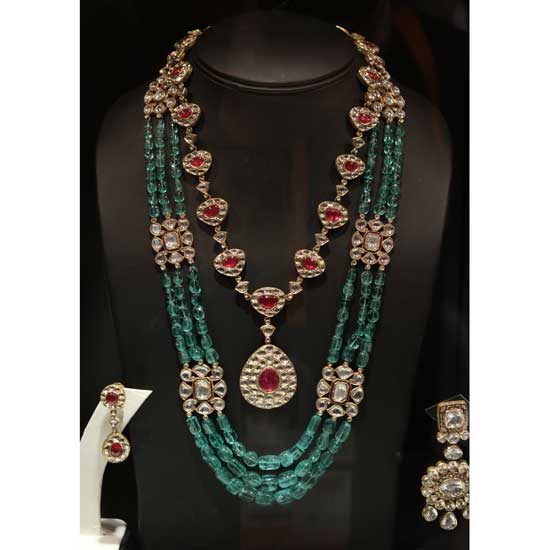 The beautiful necklace is well designed for ladies. The well-cut mughal and emerald stones add a sophisticated touch to the necklace. This ladies’ necklace matches alluring evening wear in a dainty way.