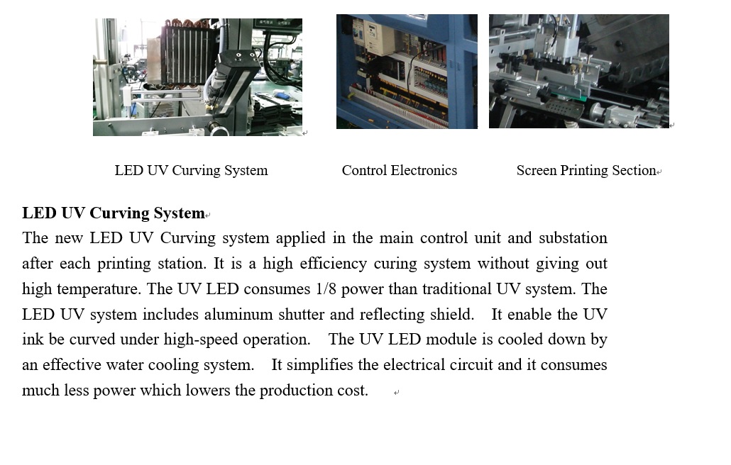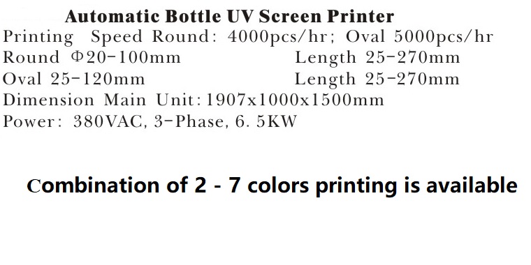 PRINTSO Multi-color automatic bottle UV screen printer is a sophisticated machine. The design provides extremely flexible and convenient in use as the whole multi-color production line is formed by independent printing station; such as main control unit and substation. The main control unit is equipped with controlling computer, frame treatment, auto-loading device and a single color printing station with UV curving system. The substation is the second color screen printing station with UV curving system.. Each substation added means increasing in color printing.