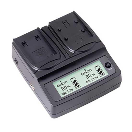 This multi-function charger charges two batteries at the same time. It features a clear LCD display which shows the charging status such as the battery capacity and the charging voltage with graphic display. The charger also offers USB power output.