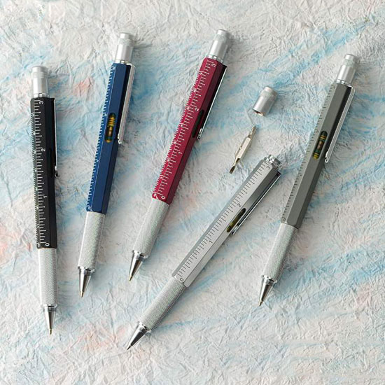 This ball pen is truly impressive with its multiple functions. The body is nicely painted with ruler scales and built with a mini level tool. A screwdriver is hidden by a stylus cap at the top.