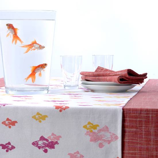 This is a table cloth with white background colour and multi-coloured fish patterns irregularly arranged allover it. This table cloth can fit in homes of various styles and give a harmonious feeling. It is suitable for both round tables and rectangular tables.