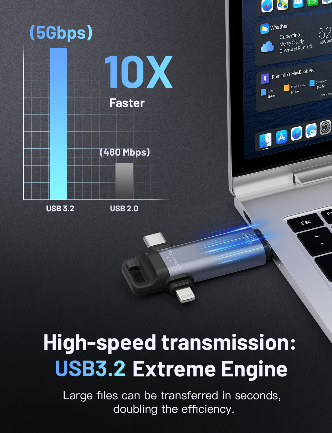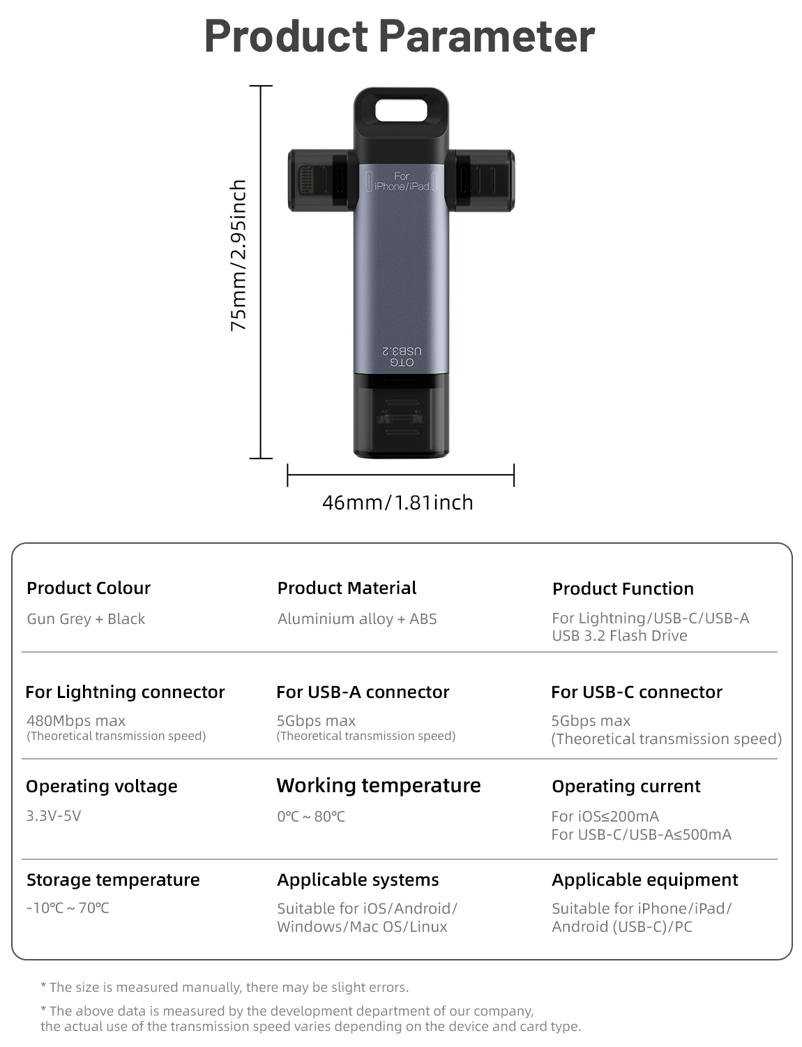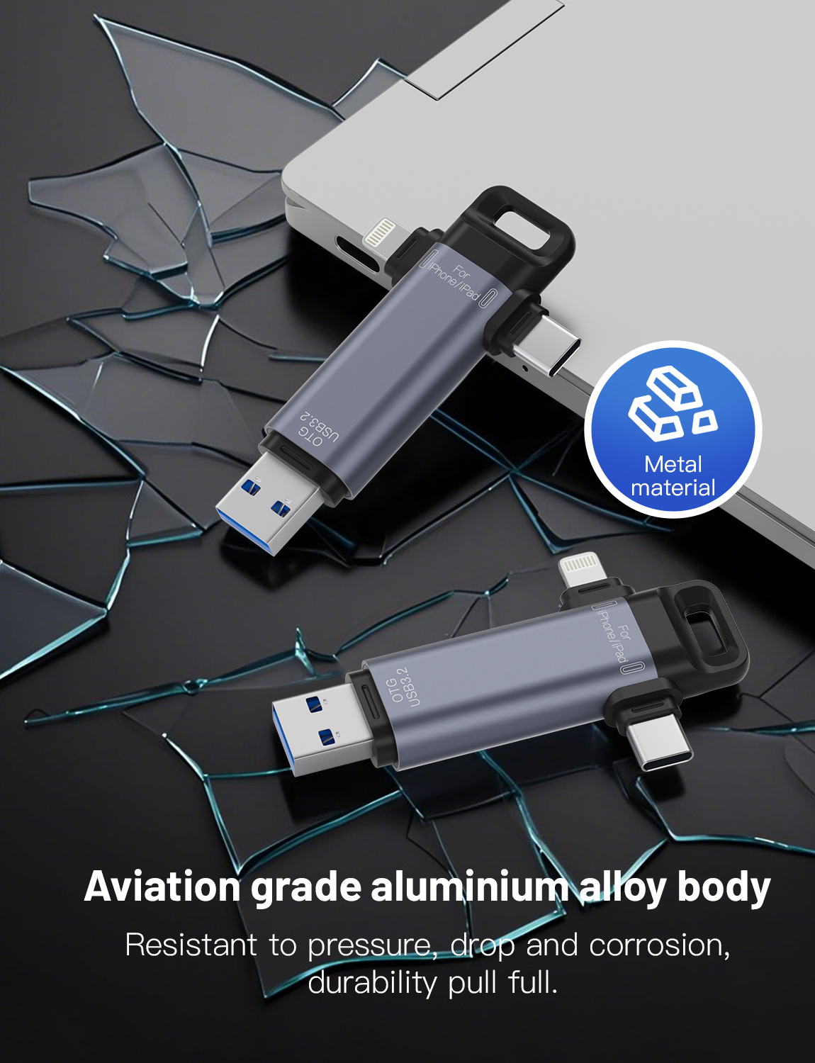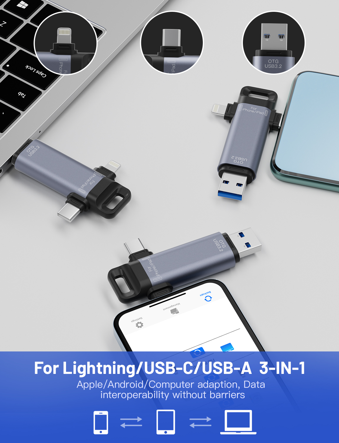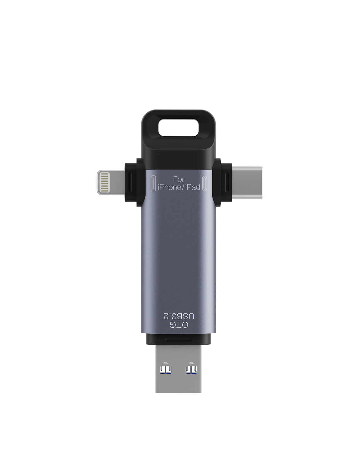 As a professional digital accessories provider, ZOIOT presents this 3-in-1 USB 3.2 flash drive, designed for seamless cross-device data storage and sharing. Featuring Lightning, USB-A 3.2, and USB-C 3.2 triple interfaces, it supports plug-and-play across iOS, Android, Windows, Mac, and Linux systems, delivering high-speed transmission (USB-A/USB-C up to 5Gbps, Lightning up to 480Mbps) to transfer large files in seconds. Crafted from aviation-grade aluminum alloy with a durable ABS build, it resists pressure, drops, and corrosion, while its compact 75mm size ensures easy portability. Ideal for expanding phone/tablet storage and backing up photos, videos, and contacts, it eliminates memory anxiety for Apple and Android users, catering to cross-border e-commerce, wholesale, and corporate procurement needs with reliable performance.