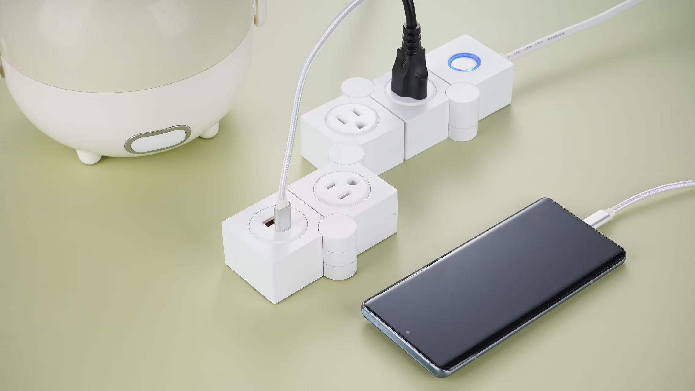 The strip rotates freely for flexible positioning and includes Type-C fast charging, making it easy to charge several devices at once.