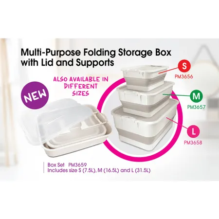 Each set includes three storage boxes : 1. size : L36.5 X W26.0 X H14.0cm / 7.5L (PM3656); 2. size : L44.5 X W31.5 X H17.5cm / 16.5L (PM3657) & 3. size : L52.0 X W38.0 X H22.0cm / 31.5L (PM3658)