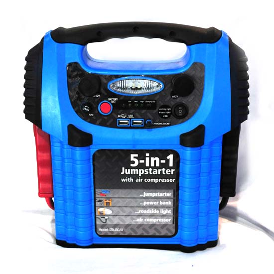 Showcased here is a 4-in-1 jump starter that is powered by a 12V 10Ah sealed rechargeable lead acid battery. The featured product not only functions as a jump starter, but also as an air compressor, a power band and a roadside light. This multifunctional jump starter is equipped with overload protection for enhanced safety.