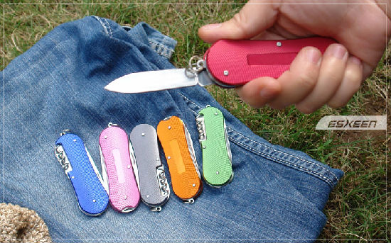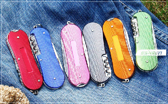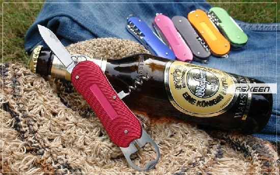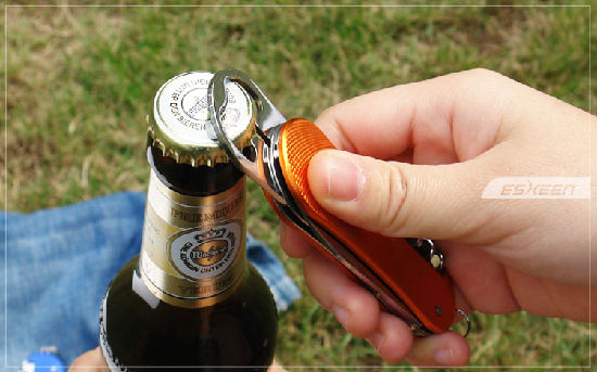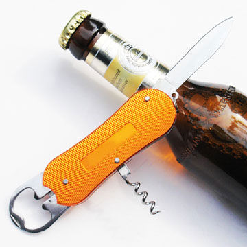 The multifunctional pocket knife boasts a compact design for easy carrying. It features a stainless steel knife, a corkscrew and a bottle opener. The contoured aluminum handle offers a secure grip.