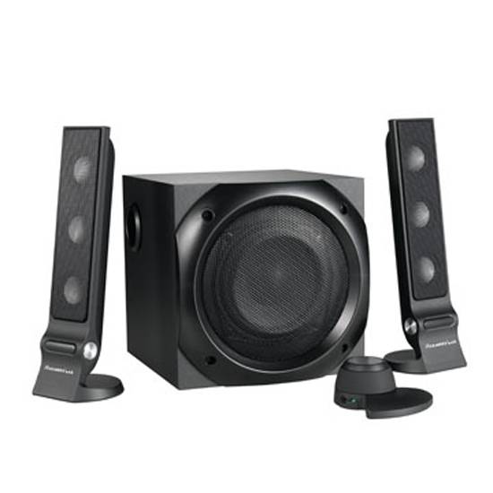 This is a set of 2.1 computer speakers with a digital line controller and backboard bass control. The black set has one cubic speaker and two rectangular tower speakers, which is modern and stylish in design.