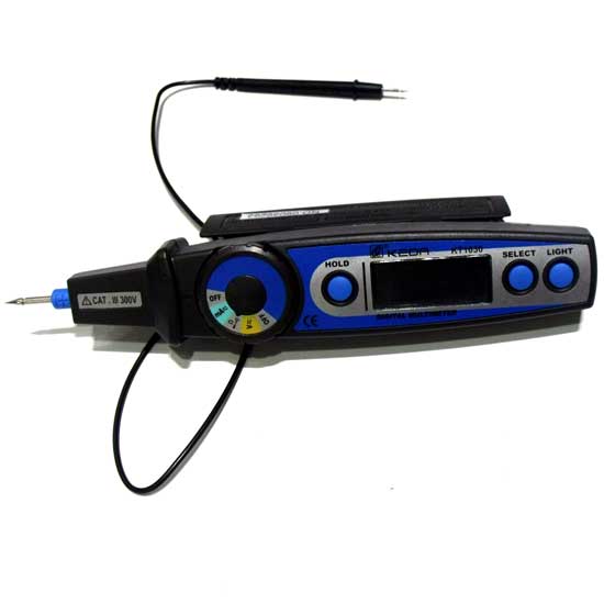 This auto-ranging multimeter is designed to measure voltage, current, and resistance. The multimeter's design resembles the appearance of a pen, making it compact, lightweight, and easily portable. It is professionally manufactured for enduring performance.
