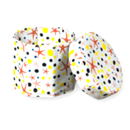 The multipurpose storage box comes in a cylindrical shape. Its lid and shell are trimmed with dynamic colored patterns. This box is also finished with an ample capacity.