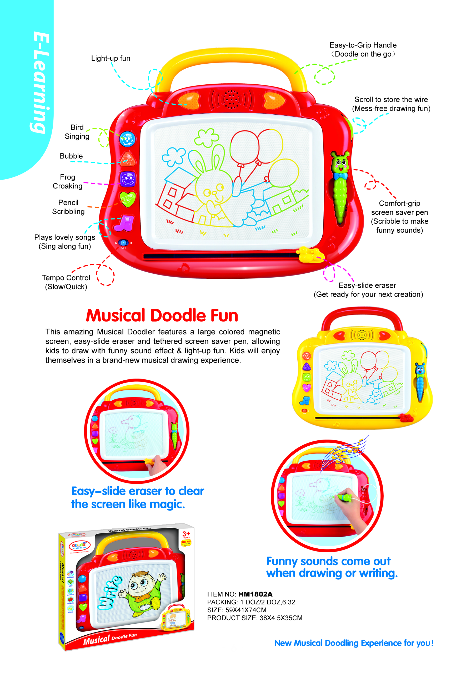 Musical Doodle Fun features a colored magnetic screen, easy-slide eraser and tethered screen saver pen, allowing kids to draw with funny sound effect and light-up fun.(batteries not included,2XAA)