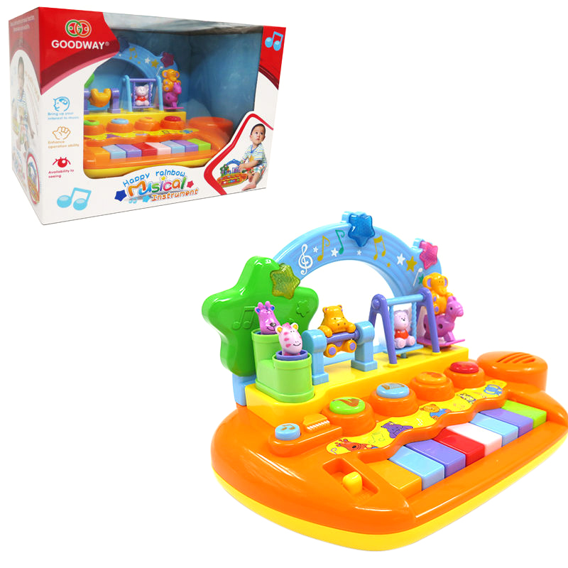 The highlighted toy piano has colorful keys for playing music and has round buttons for making sounds of different instruments. It is decorated with cute cartoonish animals and has a rainbow adorned with stars at the back. This toy piano can stimulate baby's hearing and is excellent for enlightening the musical talent of babies.