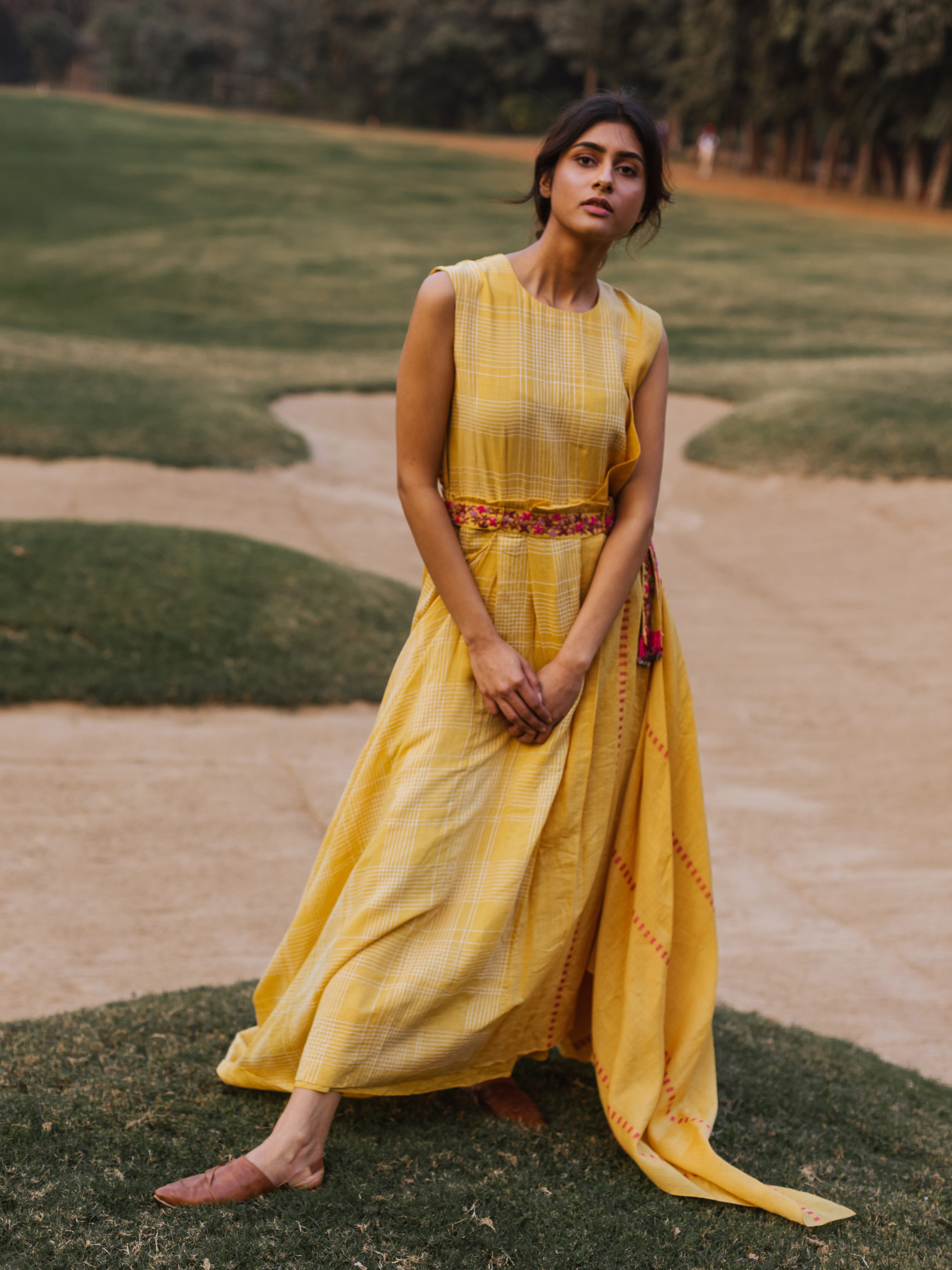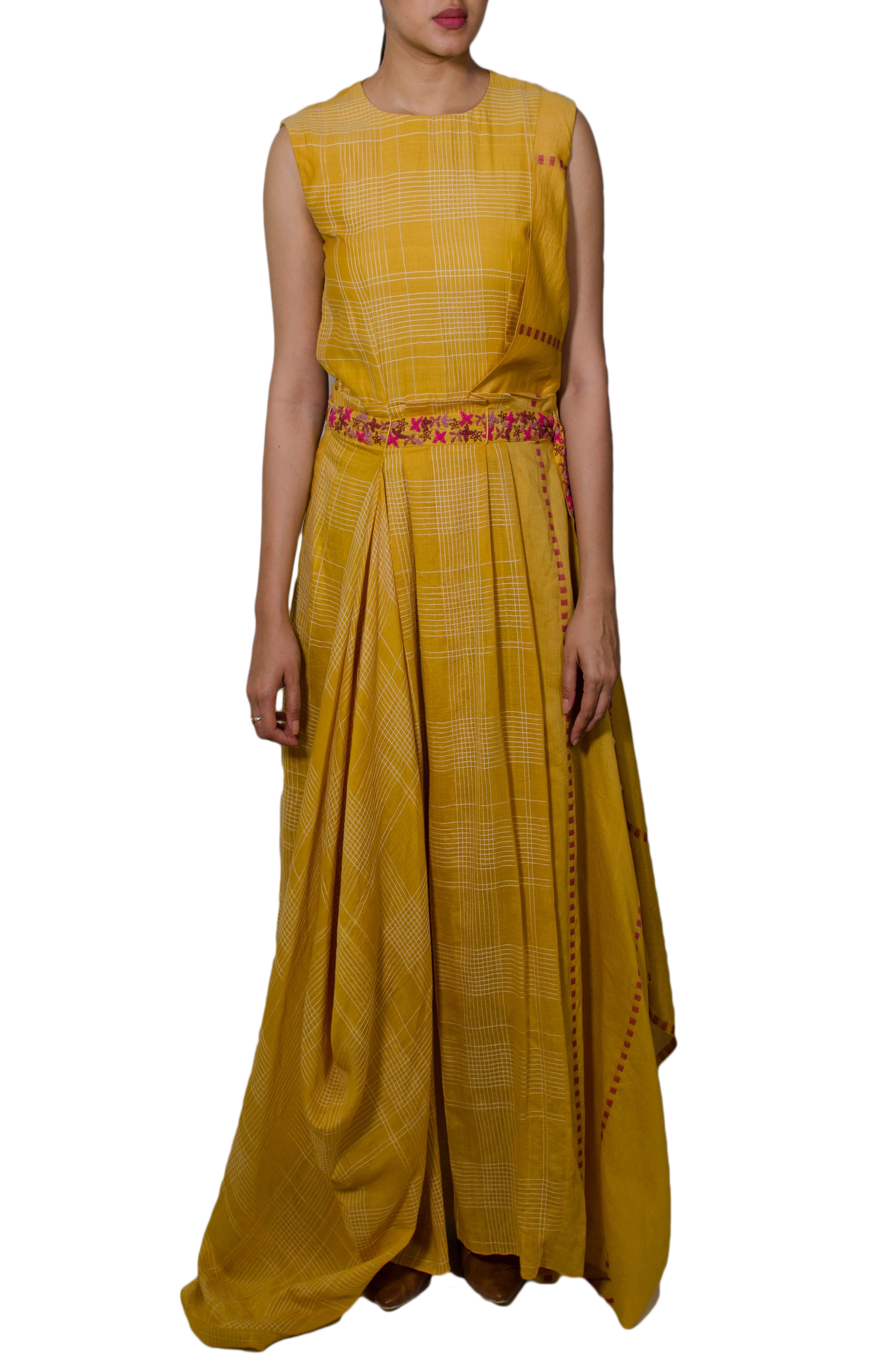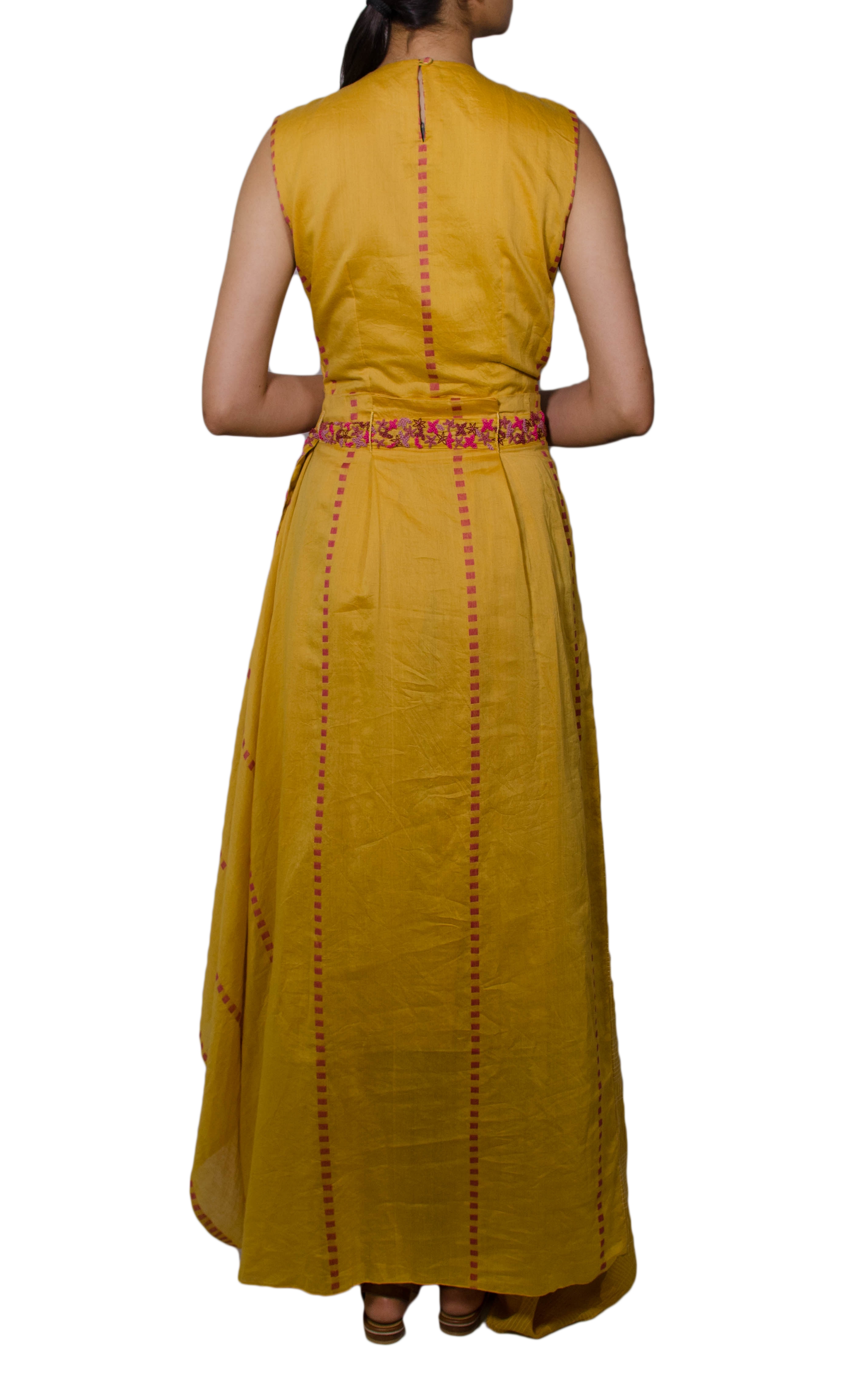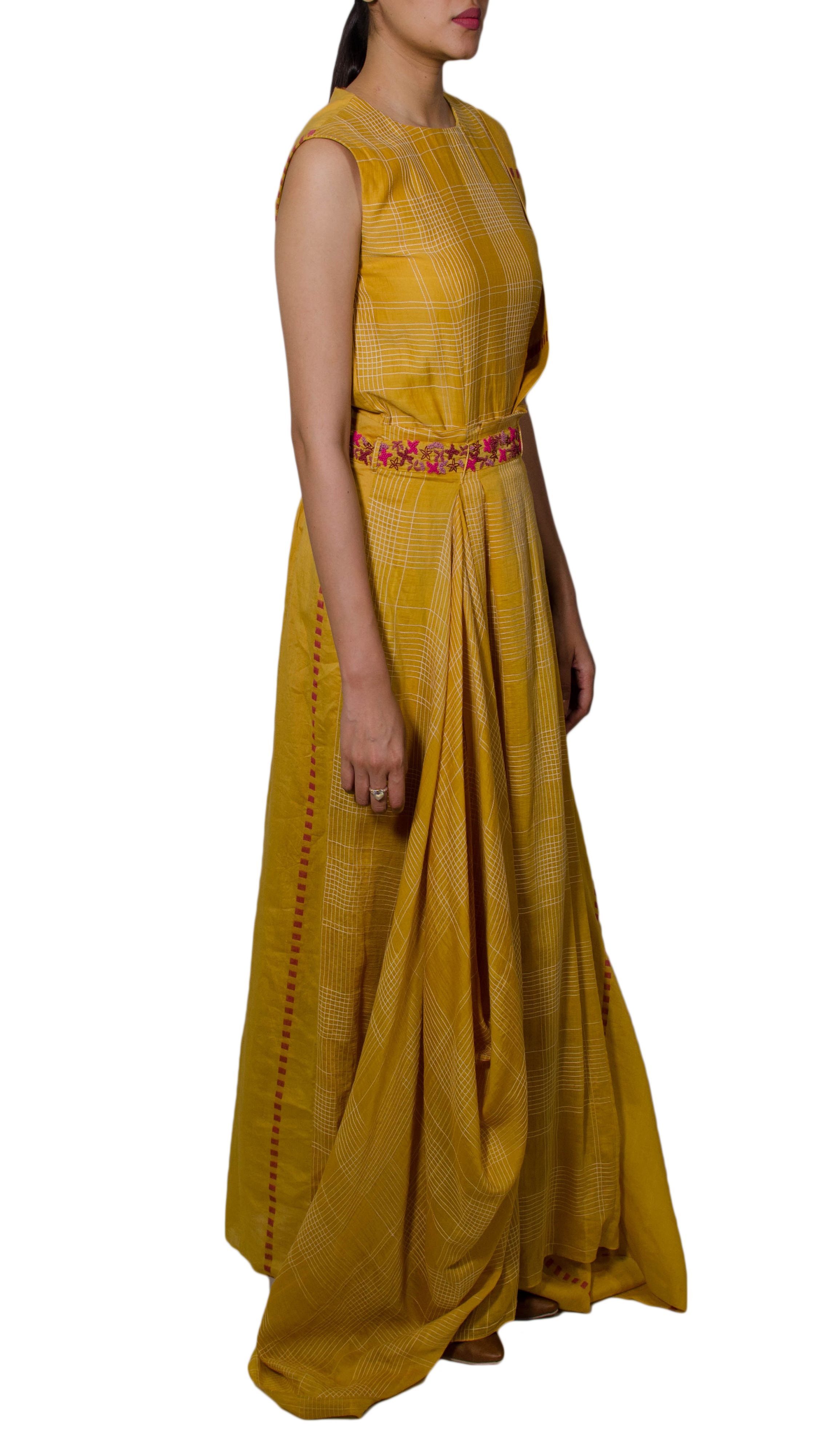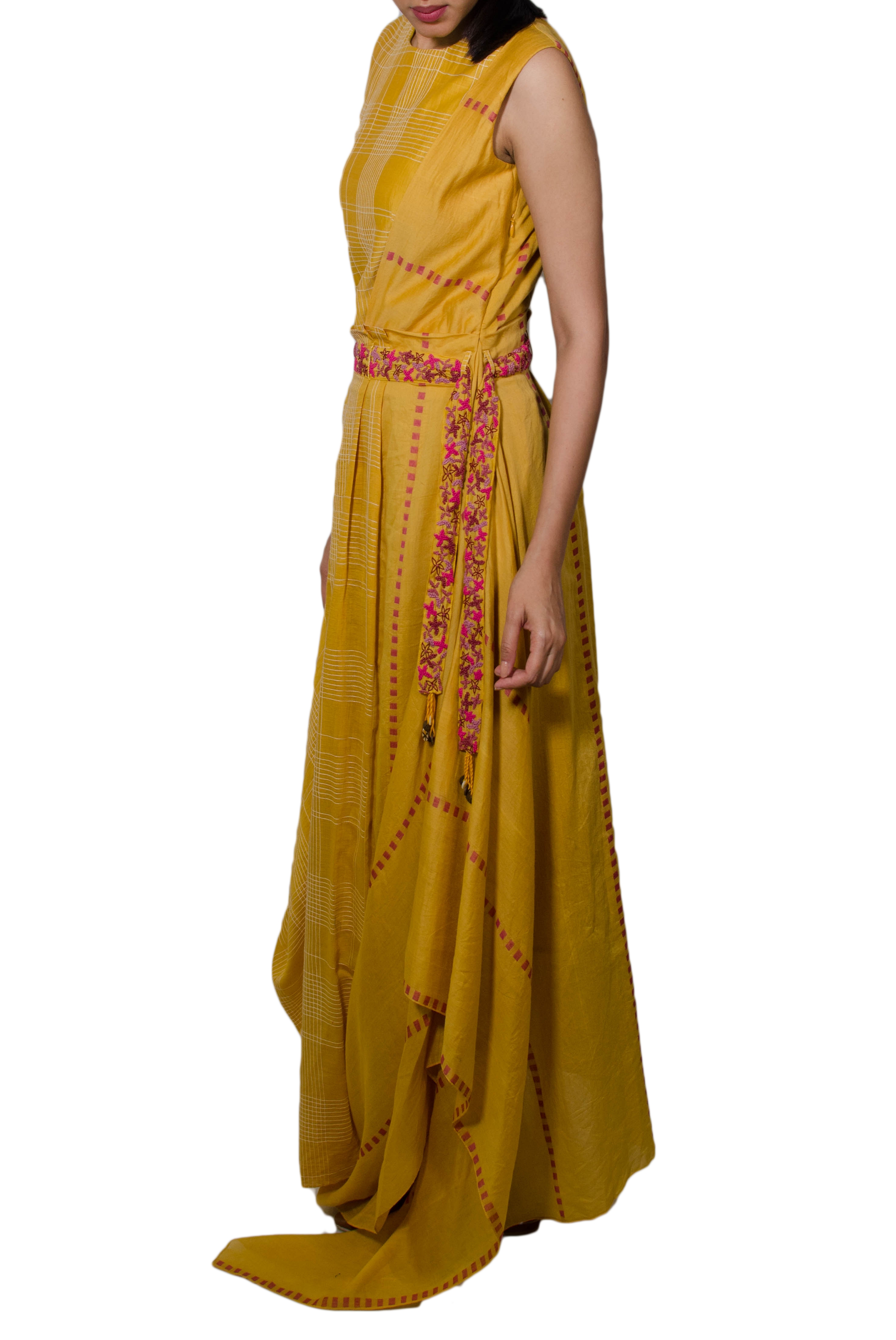 Mustard Drape Dress With Embroidered Belt