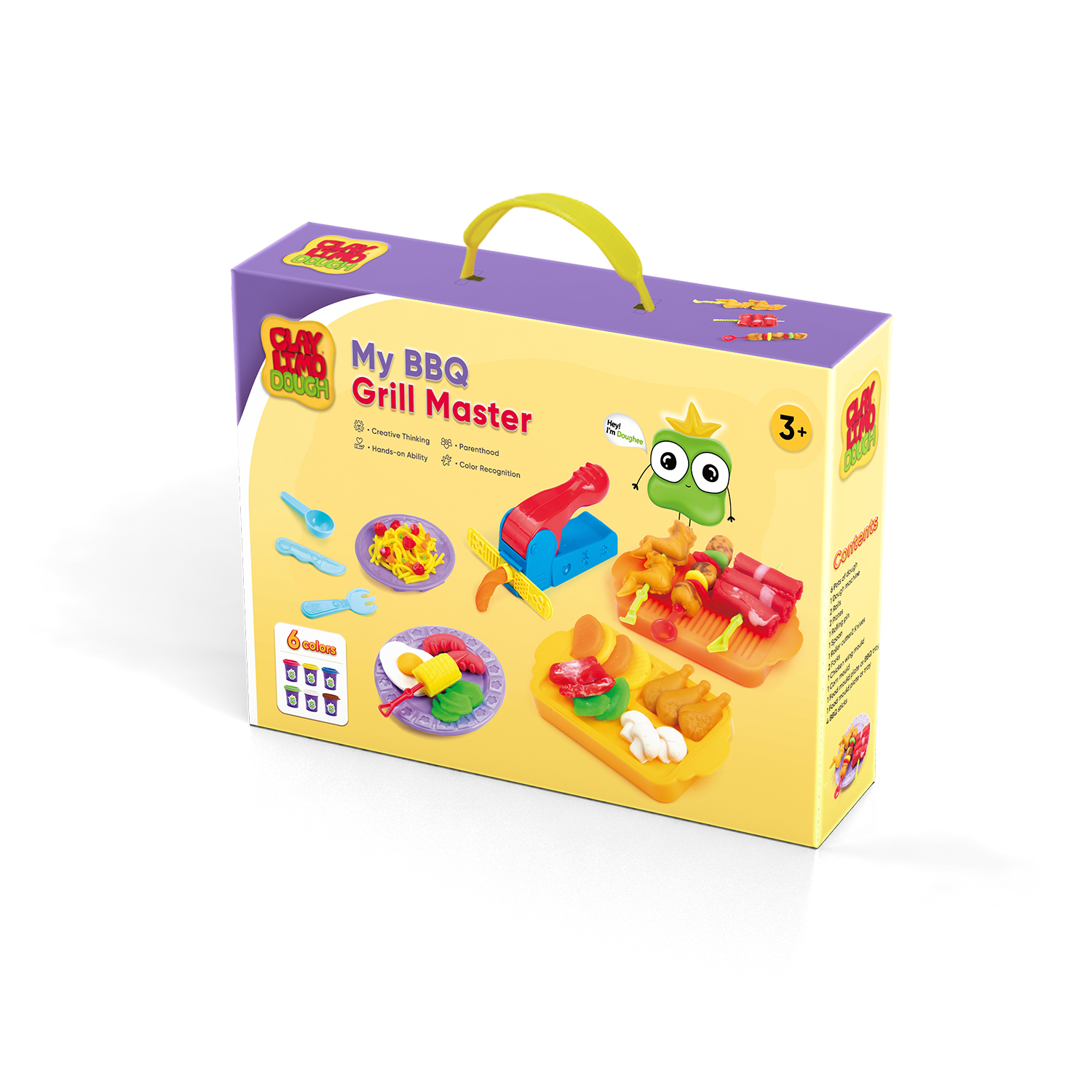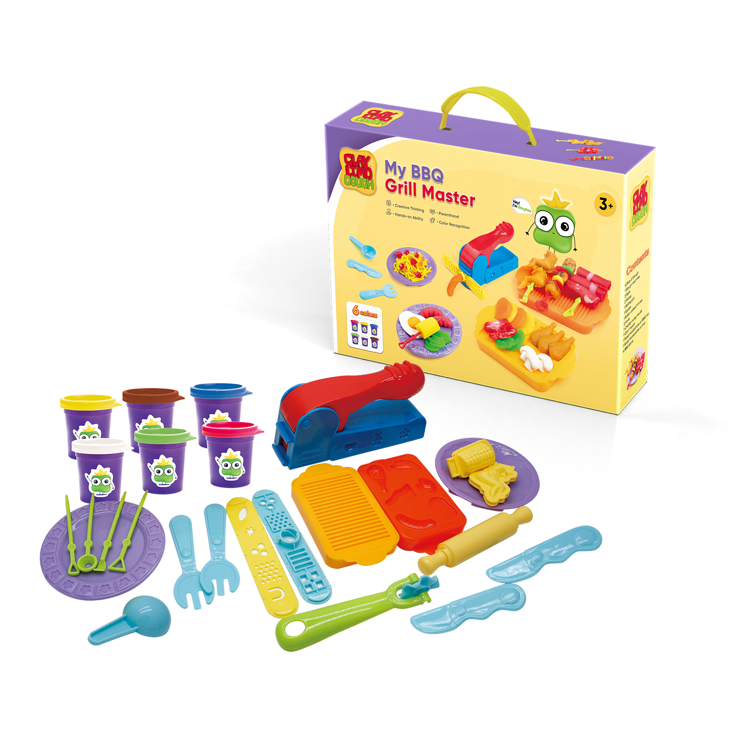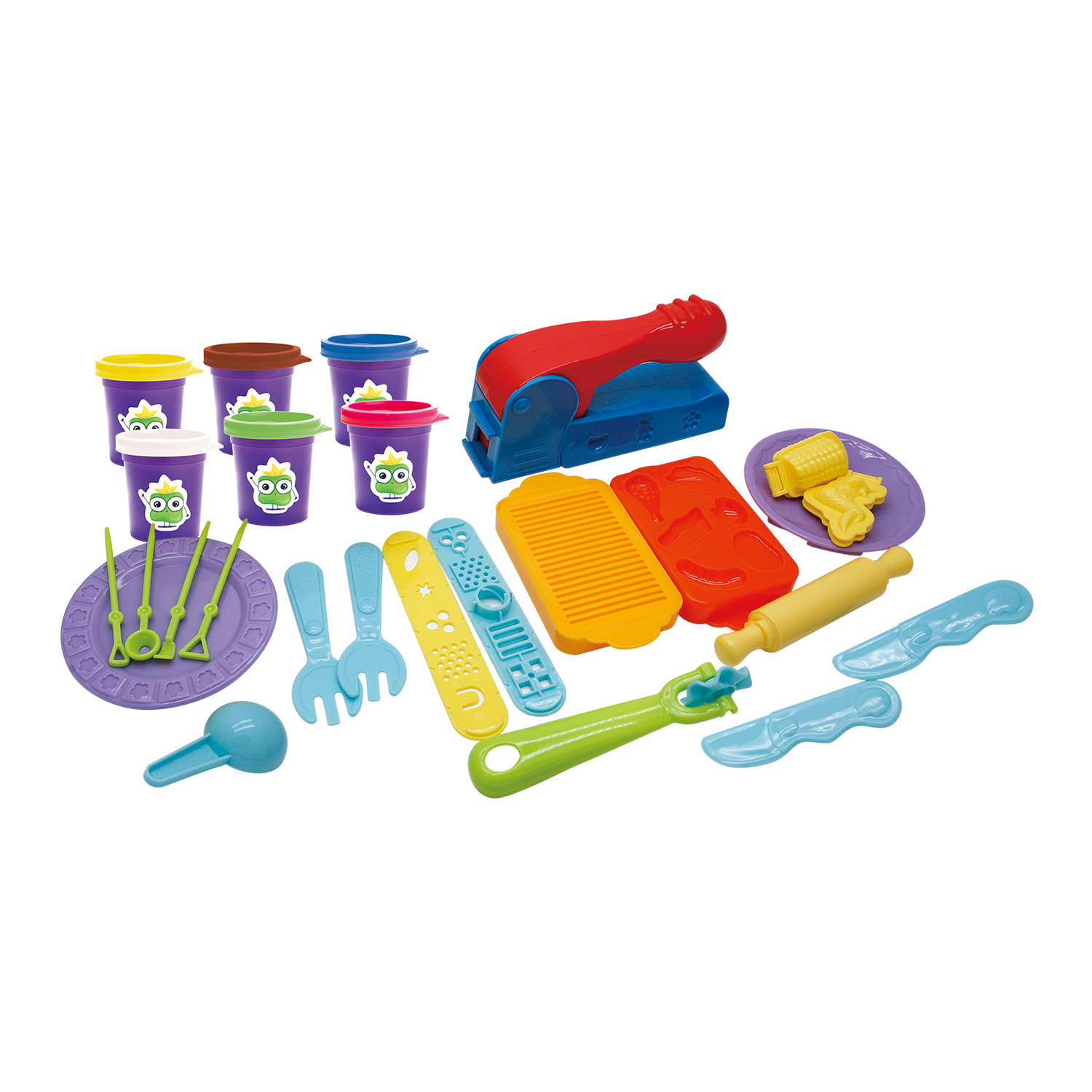 6 colours of dough,2 fork,1 spoon,2 knifes,2 rullers,1 rolling pin,1 rolling cutters,2 food moulds,1 extruder,1 plate