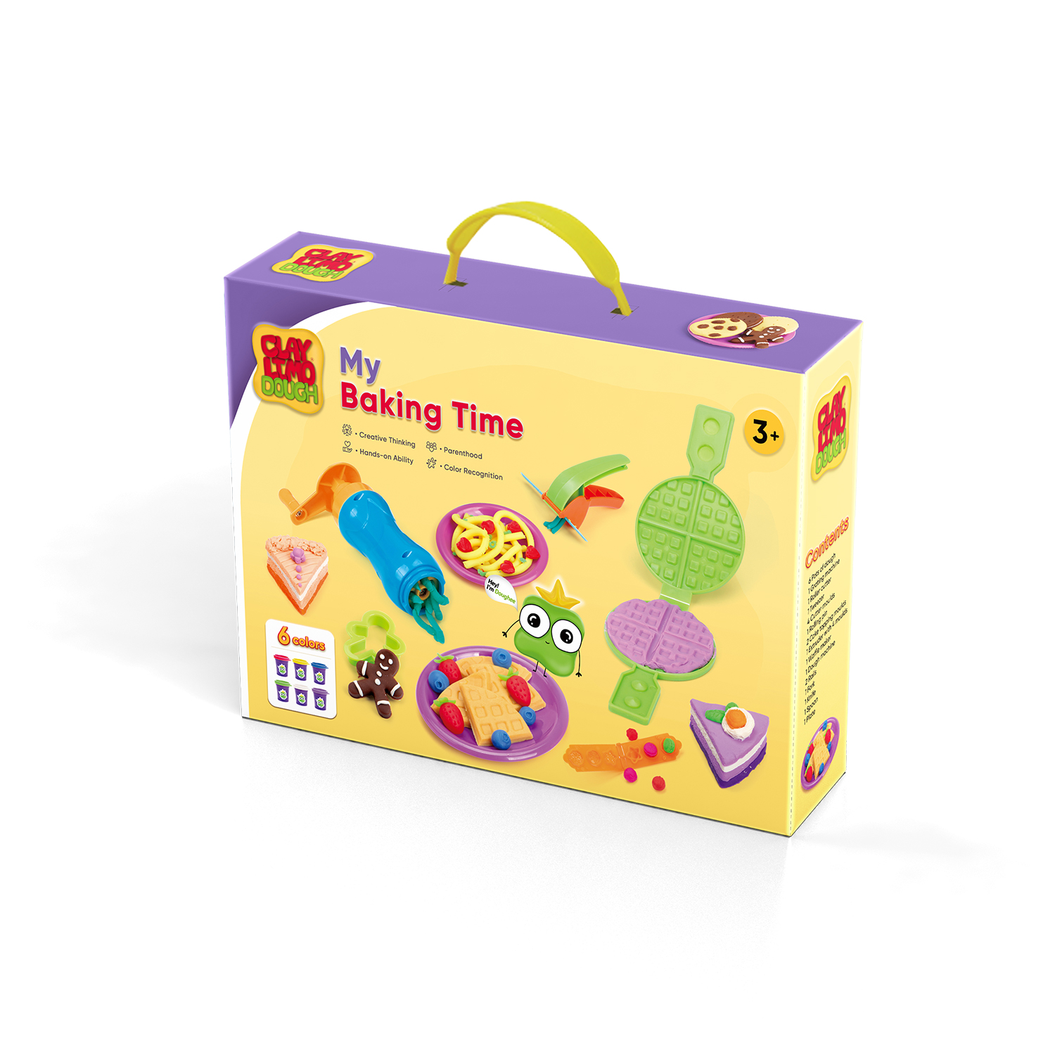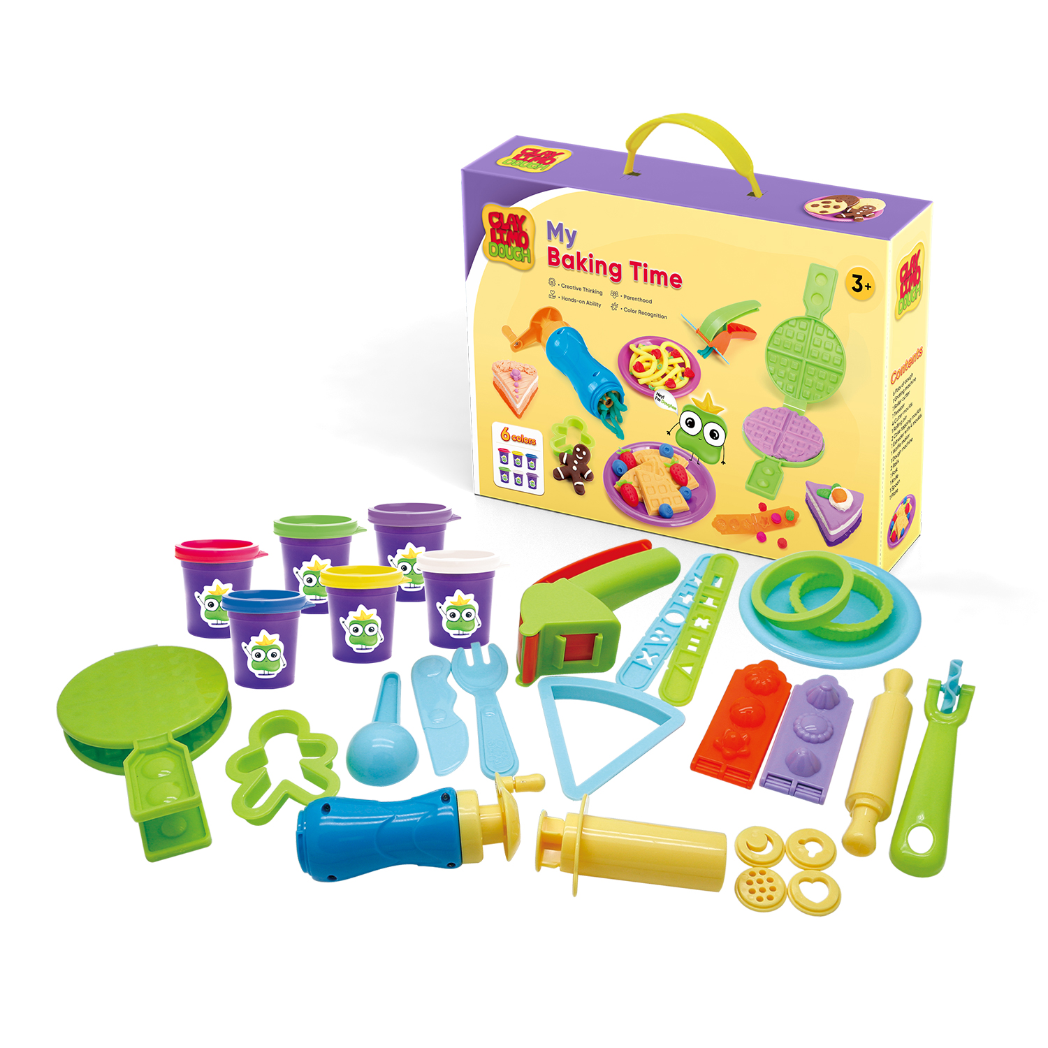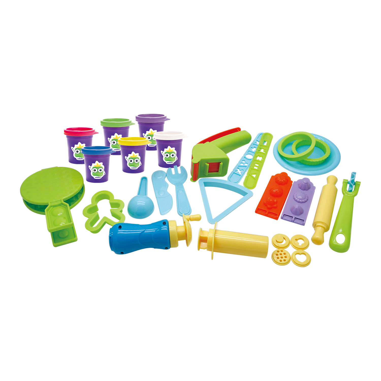 6 colours of dough,1 waffle mould,1 tweezer,1 people cutter,1 spoon,1 knife,1 fork,1 shooter with 4 lids,1 extruder,2 rullers,1 plate,1 rolling pin,1 rolling cutter,1 baking machine,5 cutters