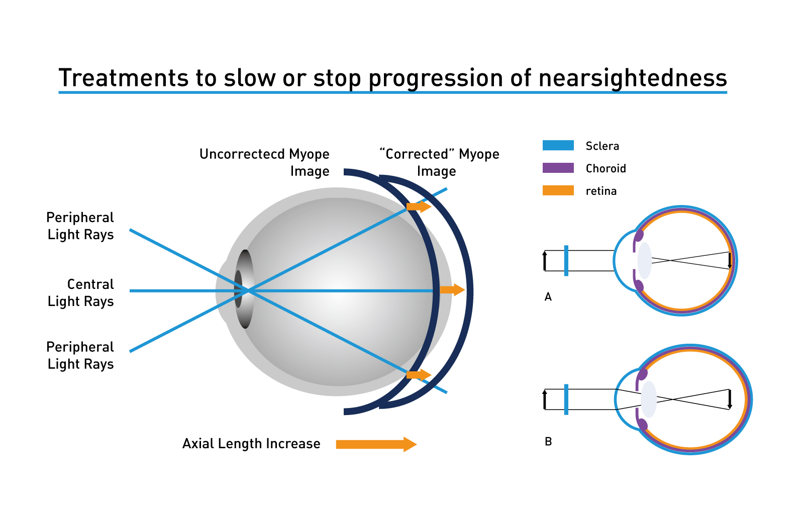 Well from the pictures above you can find -- it can change the way light focuses on the retina between the central and peripheral retinal areas. Peripheral defocus theory suggests that this designs work at controlling myopia because they create that all important peripheral myopic defocus, interrupting the feedback loop for the eye to continue lengthening that is our bane in glasses and single vision lens wear.