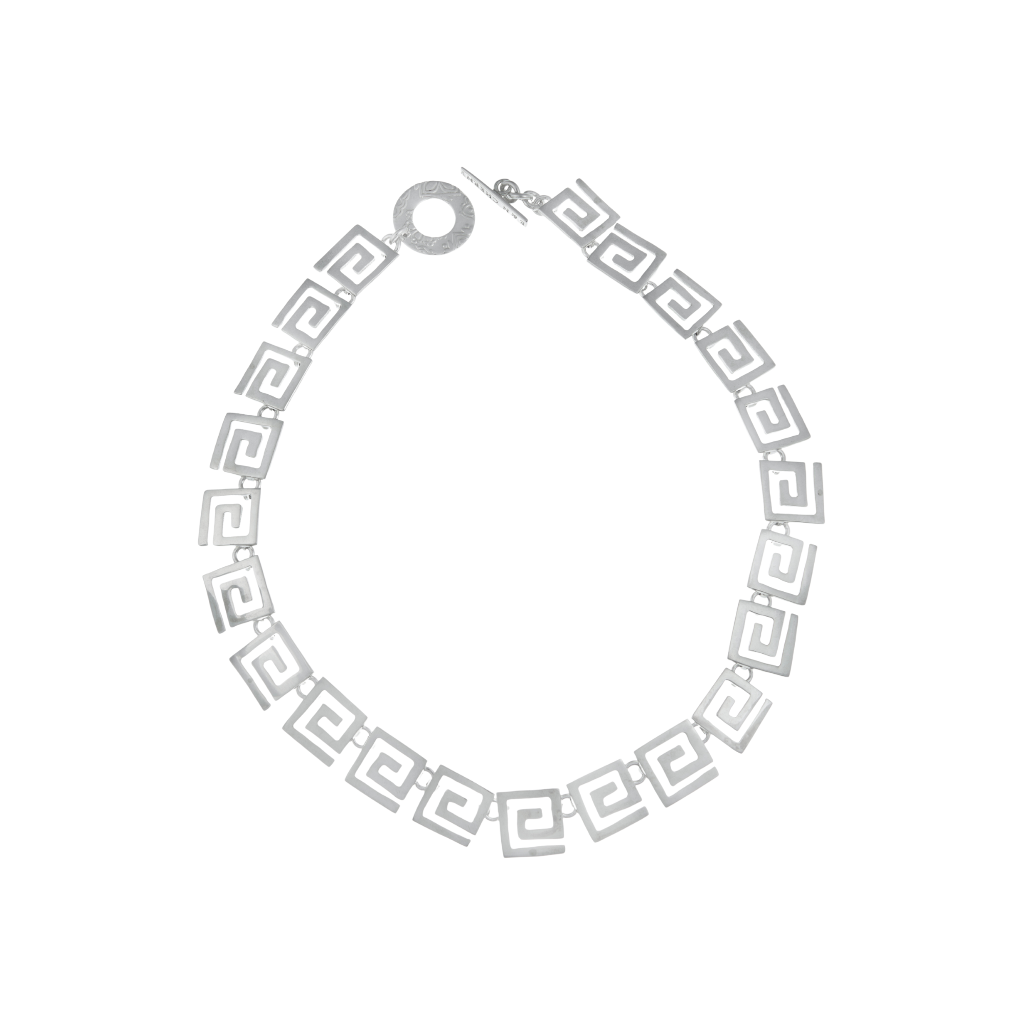 The mystery necklace, crafted in .925 silver, is a representation of enigma and sophistication. Its design incorporates fret patterns, geometric motifs that in ancient civilizations symbolized sacred ideas, the connection with the gods, and the order of the universe.
