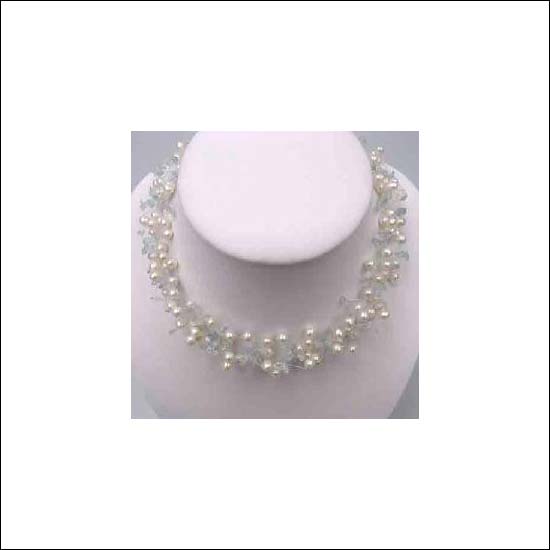 Fishing line necklace of white potato pearls and aquamarine with 925 silver clasp.